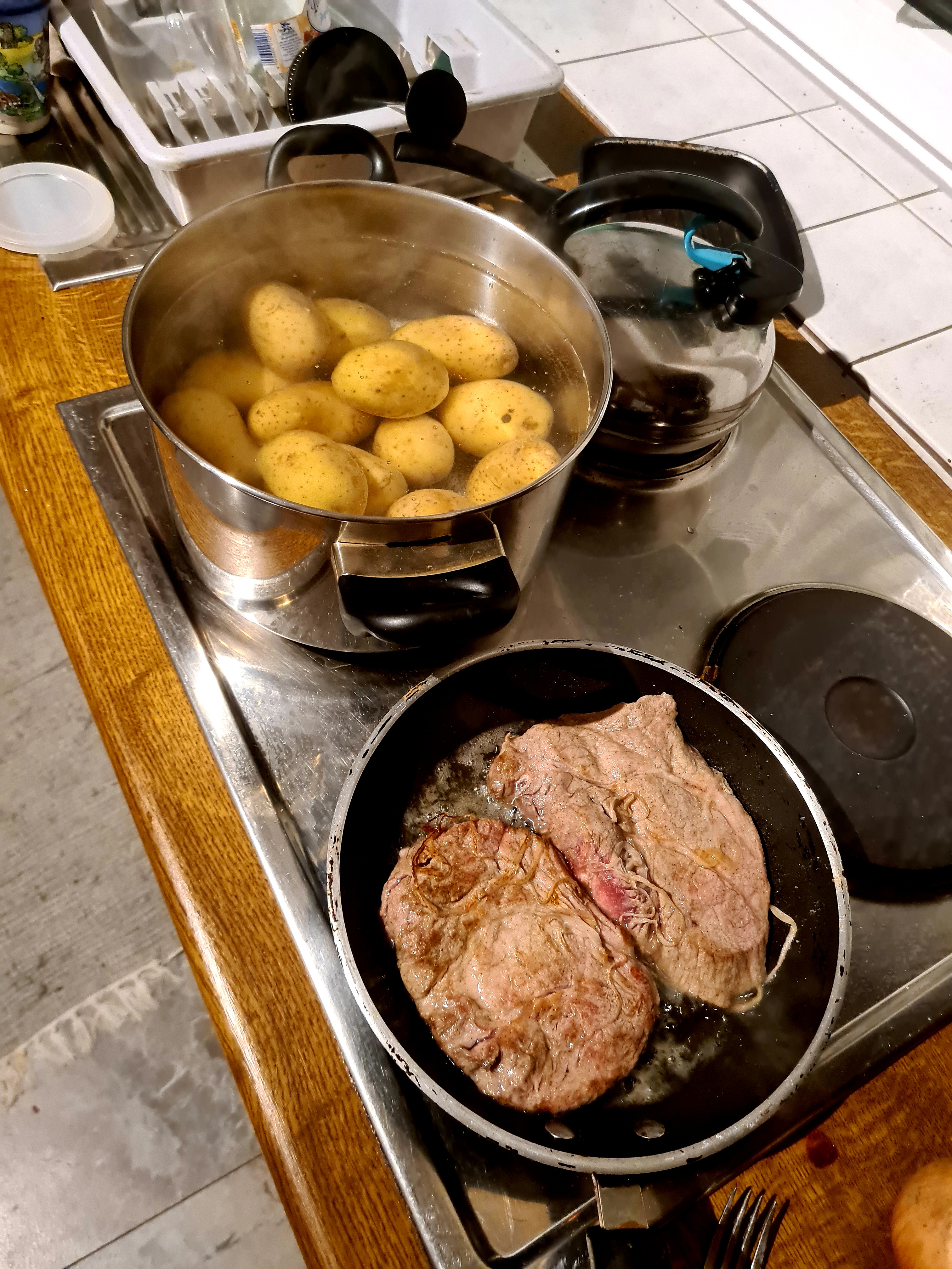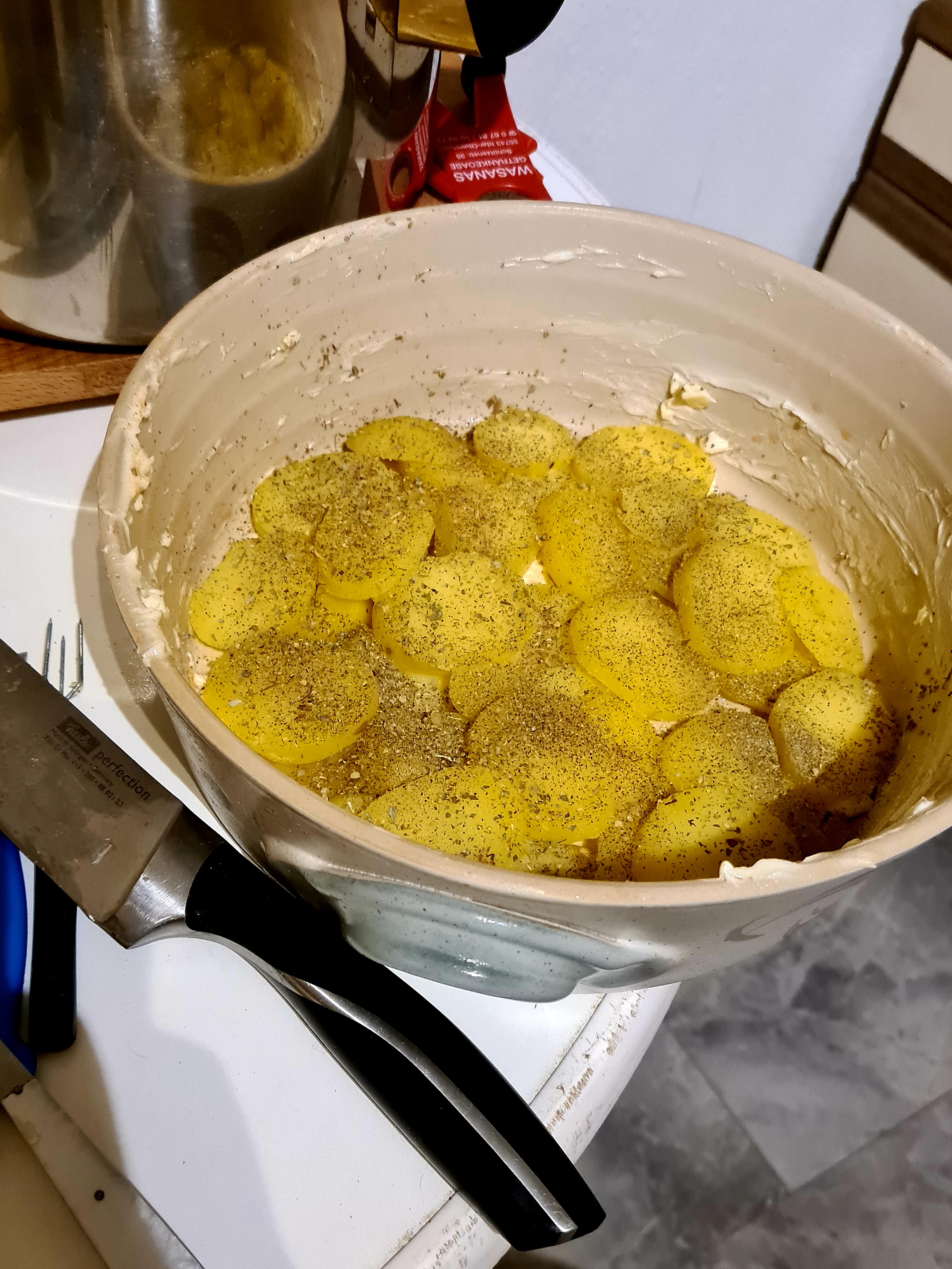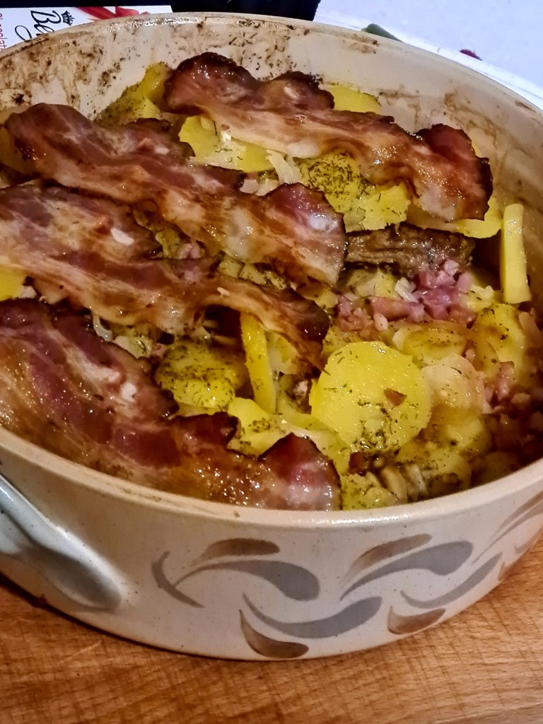 Damit das Fleisch eine ordentliche Farbe bekommt, kann man das Fleisch vorher in einer Pfanne scharf anbraten. Die Kartoffeln sollte man vorher auch kochen. Die gekochten Kartoffeln in Scheiben schneiden und Schichtweiße in den mit Butter eingeschmierte Topf legen. Nun werden die Kartoffeln mit Salz, Pfeffer, Dill, Majoran (ist jedem selbst überlassen, ob mann die Kartoffeln mit Dill und Majoran würzt), Speckwürfel und gehakte Zwiebeln gewürzt. Dann legt man das Fleisch auf diese Lage und deckt es mit einer neuen Lage Kartoffeln ab. Diese Lage wieder würzen – aber nicht zu viel Pfeffer benutzen, denn das Essen zieht beim kochen noch durch.
