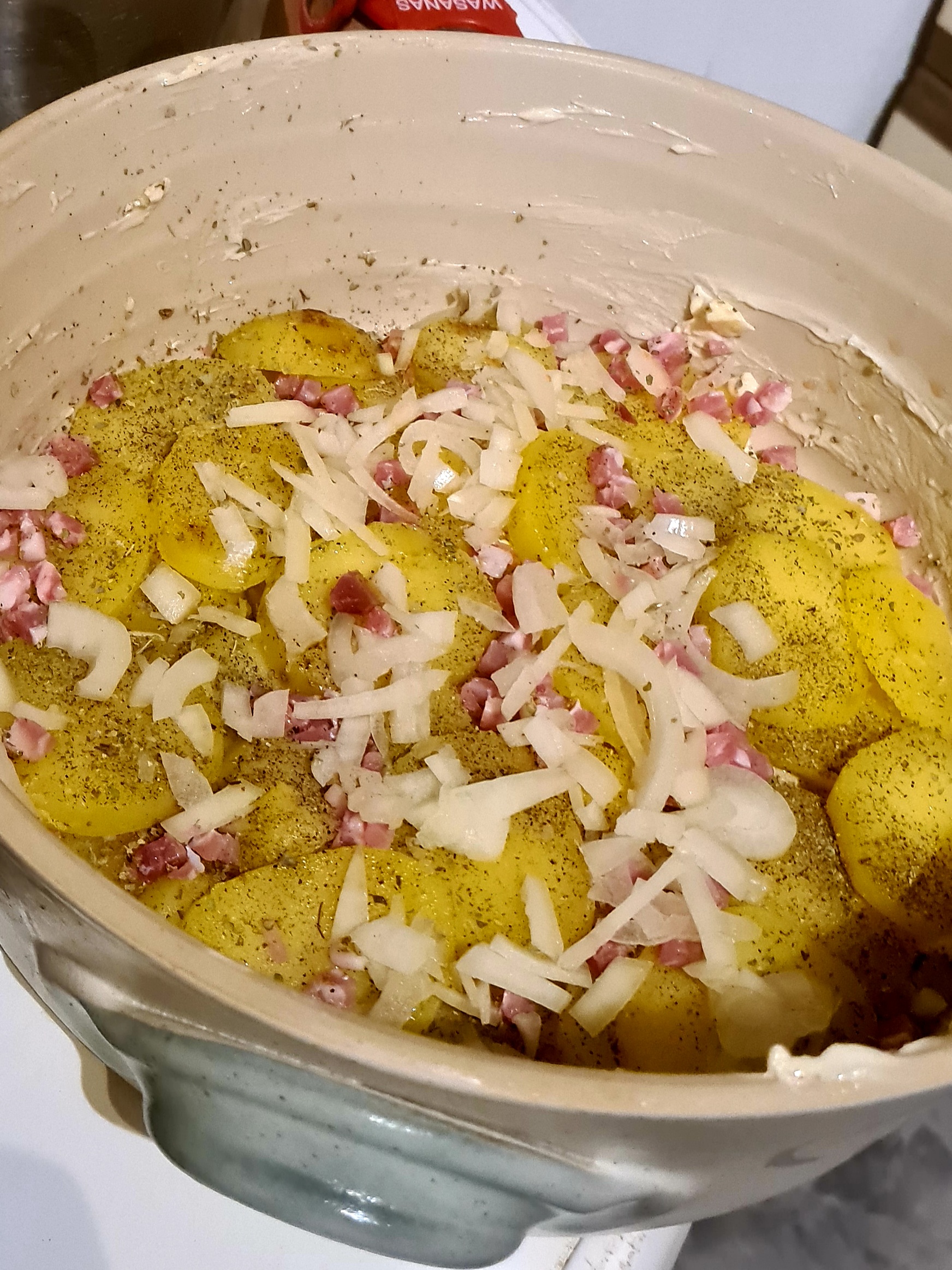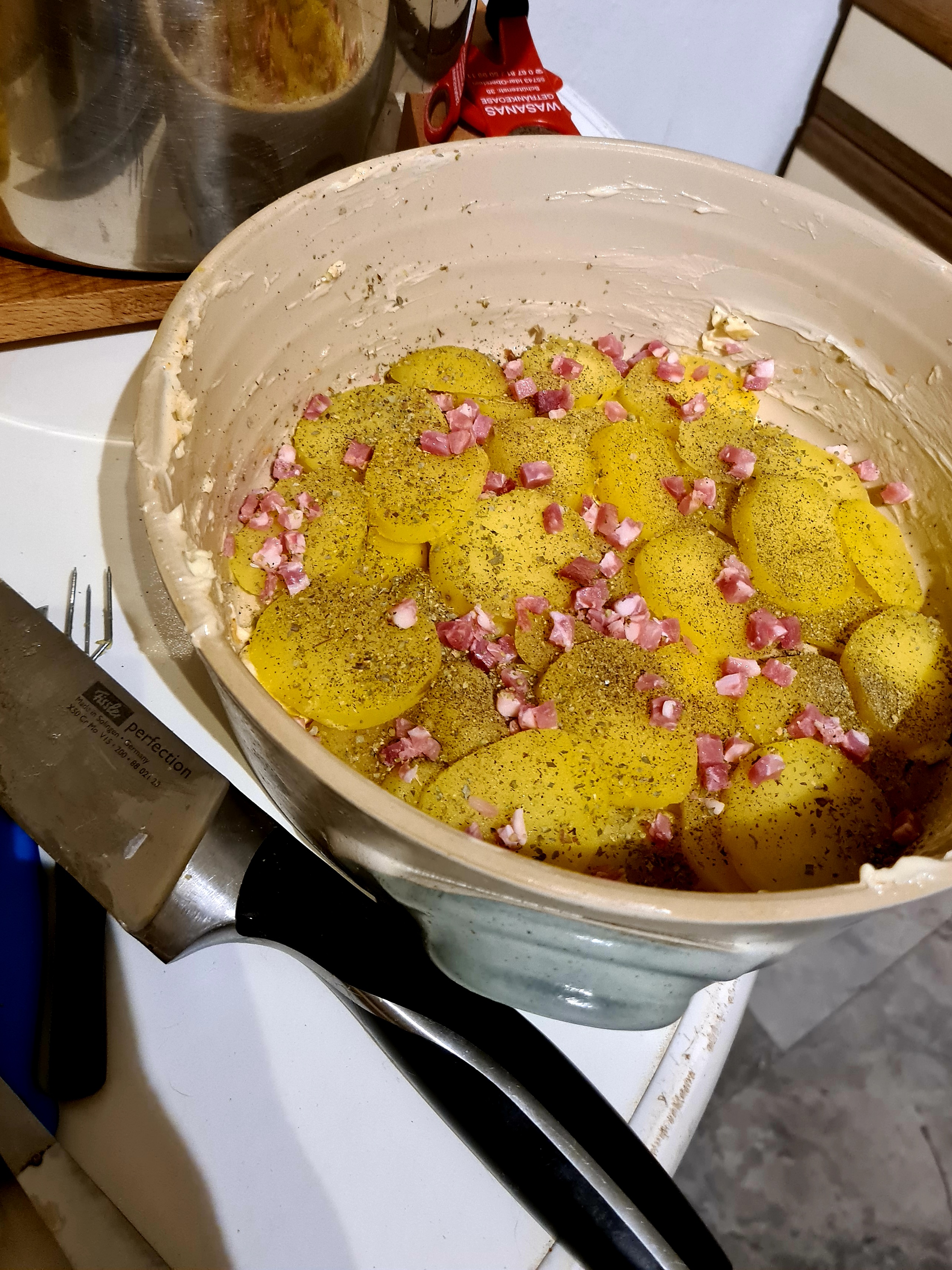 Je nachdem für wie viele Leute man Schleffersch-Gereste macht, kommt nochmal eine Lage Schweinekamm obendrauf und nochmals Kartoffeln.