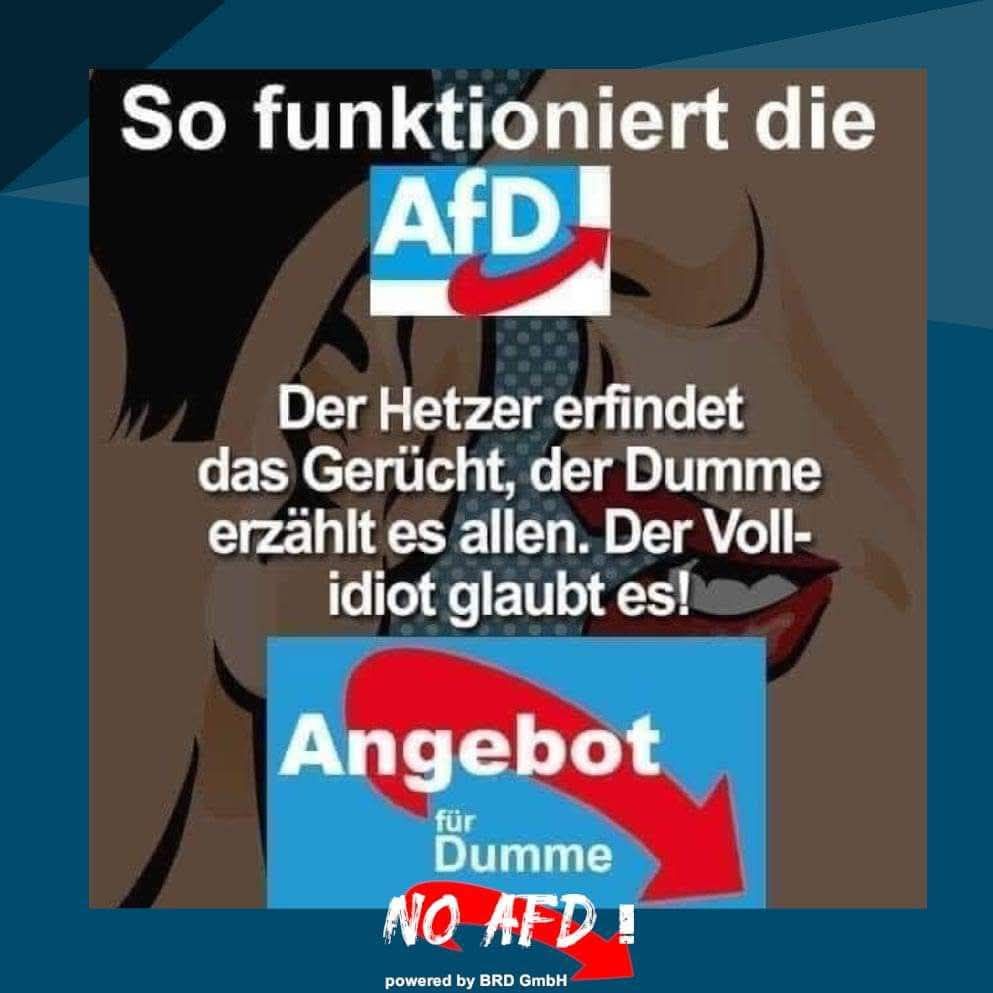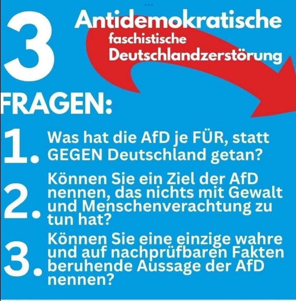 Wer eine gesicherte rechtspopulistische Partei wählt, sollte sich im klaren sein, was er oder sie tut! Ein Blick in die Geschichtsbücher reicht völlig aus, um zu sehen, wie es 1933 angefangen hat. Wollt ihr tatsächlich in die Zeit der NSDAP zurück, nur weil euch Windkraftanlagen, E-Autos oder Gender stört? Wie verblendet muss man sein, um die Nähe der AfD zu Russland, Spionage Vorwürfe für Russland und China oder die aktuelle Trump Politik nicht zu begreifen?