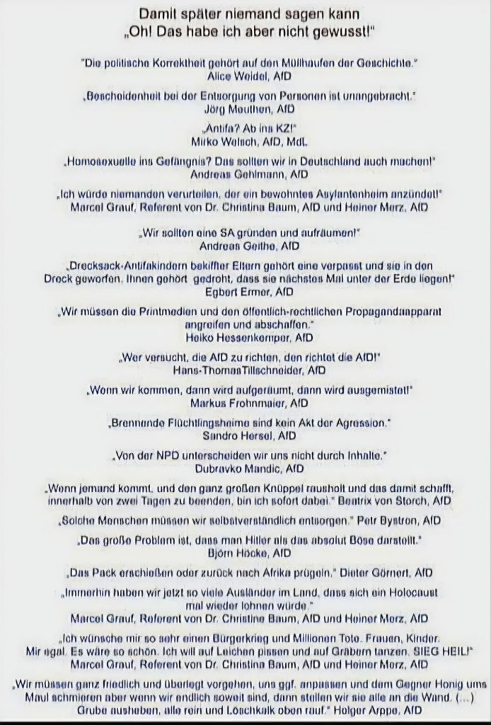 Man muss nicht unbedingt beim Verfassungsschutz arbeiten oder deren 1008 seitiges Gutachten lesen, um zu erkennen, wie rechtsradikal die AfD ist. Es reichen die stündlichen Postings auf allen sozialen Netzwerken, deren eigene Wahlplakate und natürlich die öffentlichen Äußerungen der AfD „Politiker:innen“.