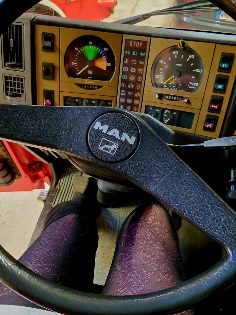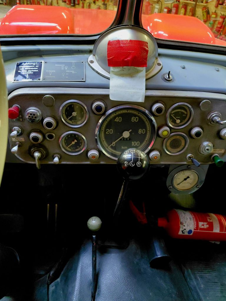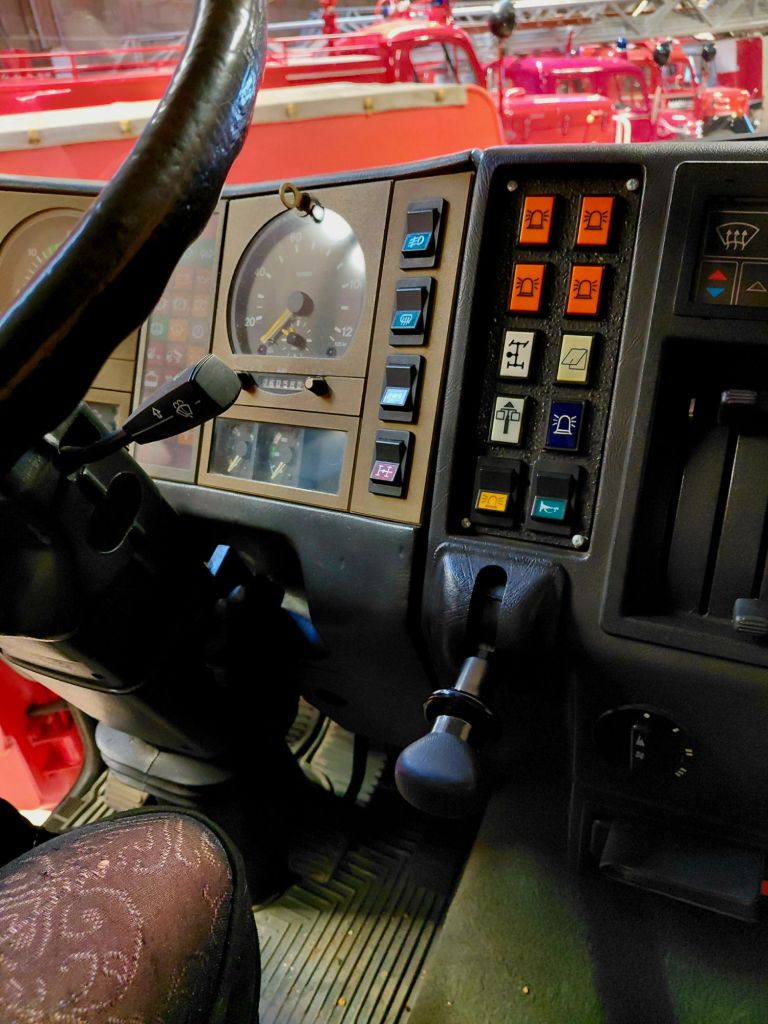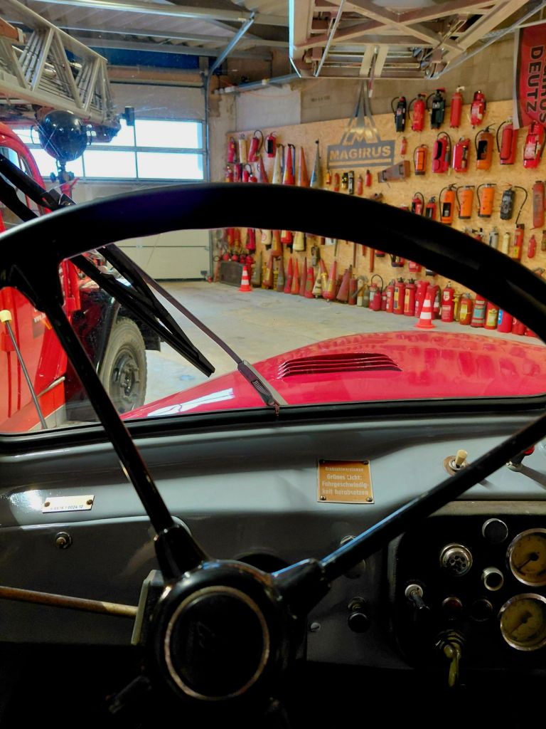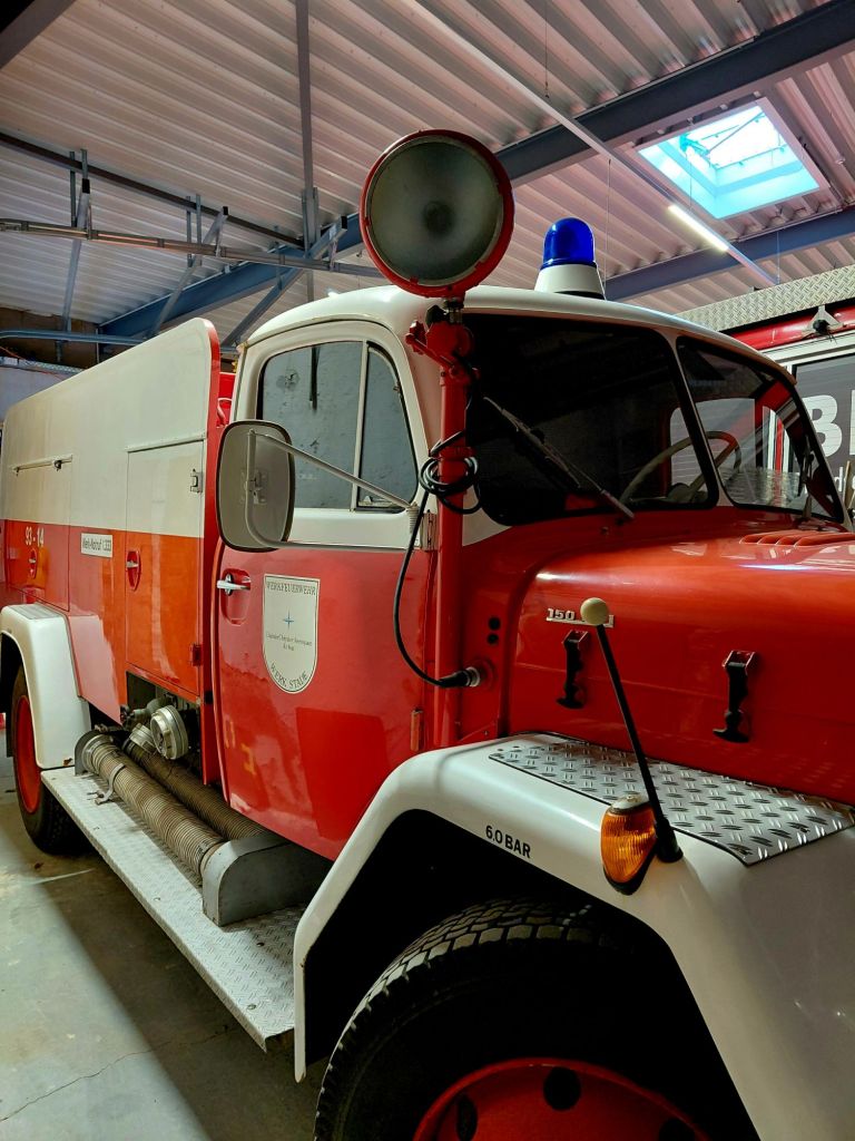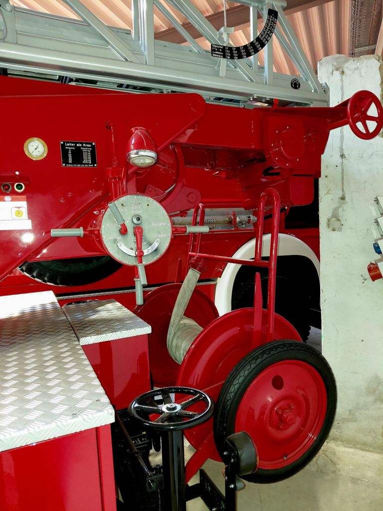 Ein „nur“ 40 Jahre alter MAN TLF steht wie ein Fels in der Brandung in der Halle. Dieses Auto hat eine Hochleistungspumpe von 40 Bar an Bord. In unfassbaren 67 Sekunden jagen 10.000 Liter Wasser durch die Rohre und Wasserkanone.