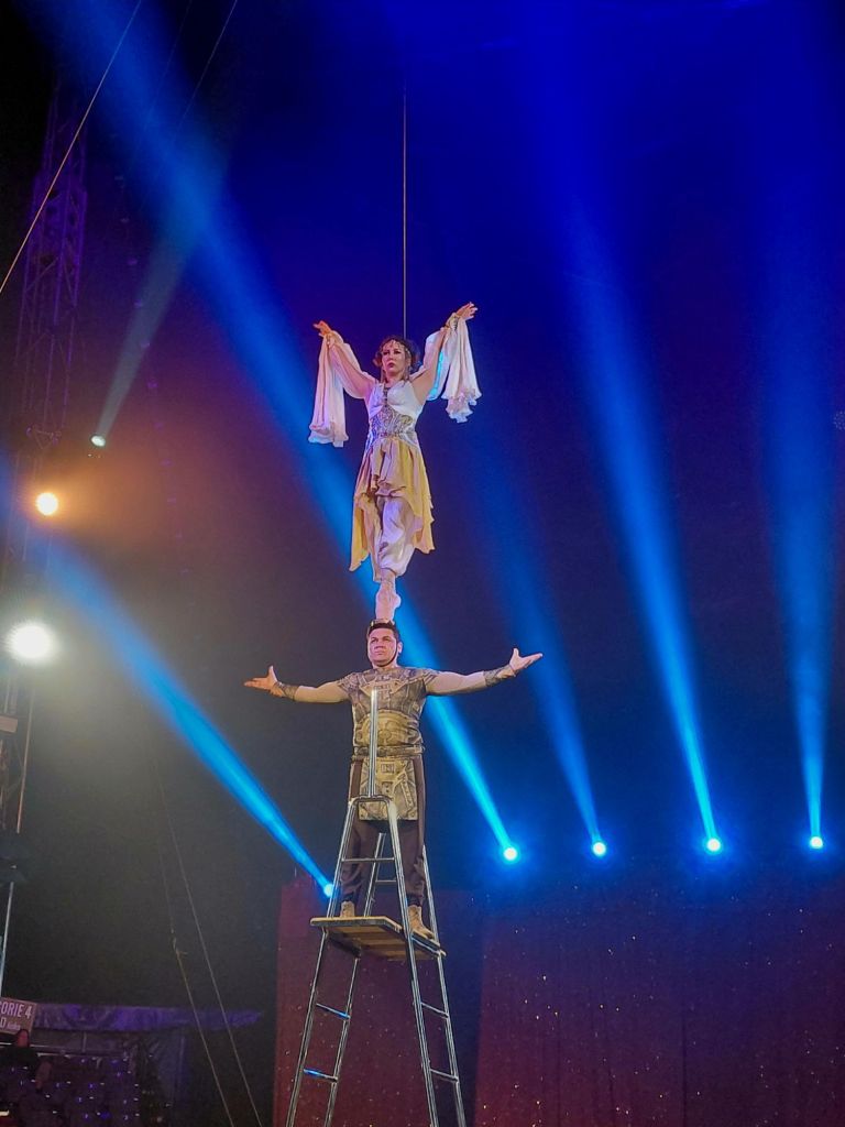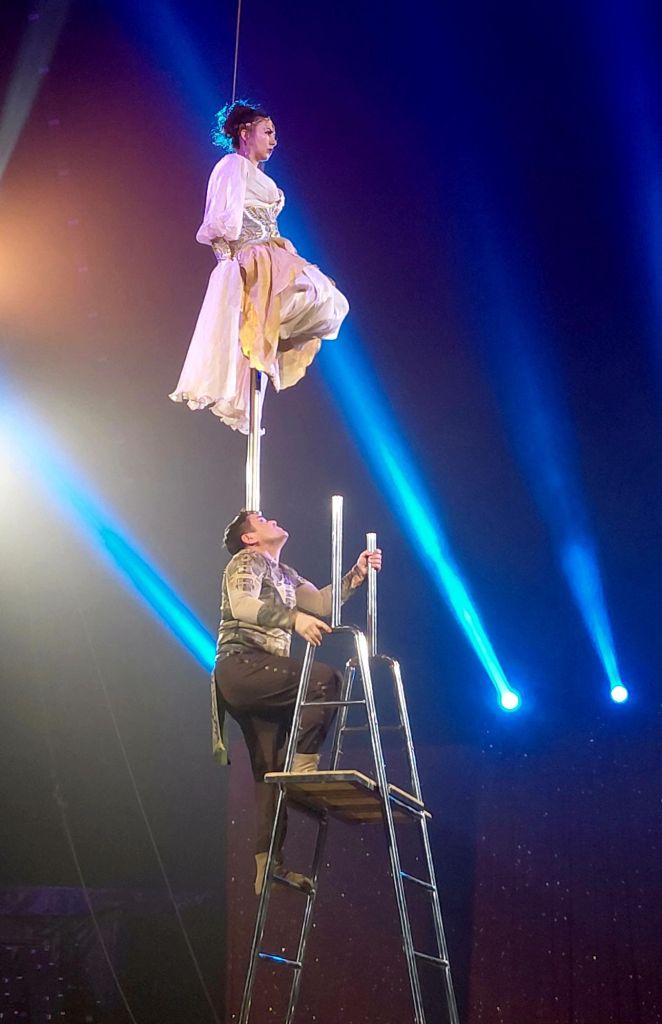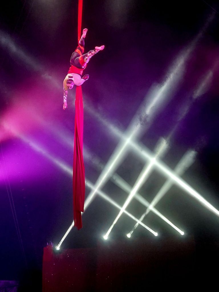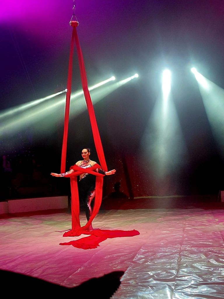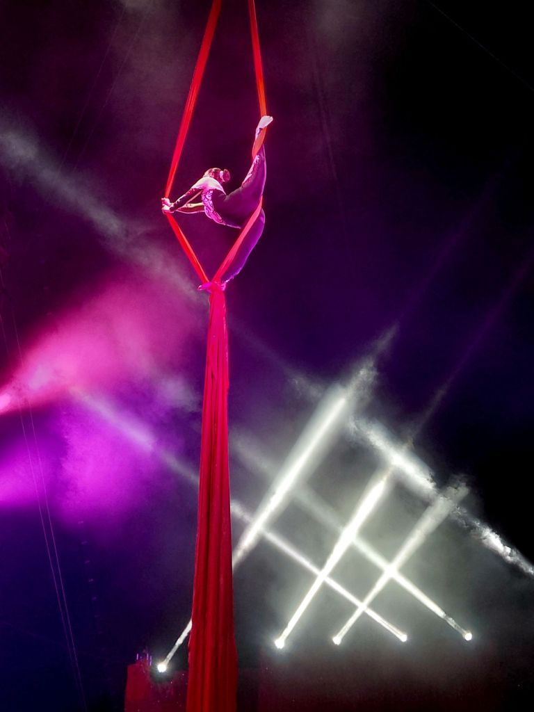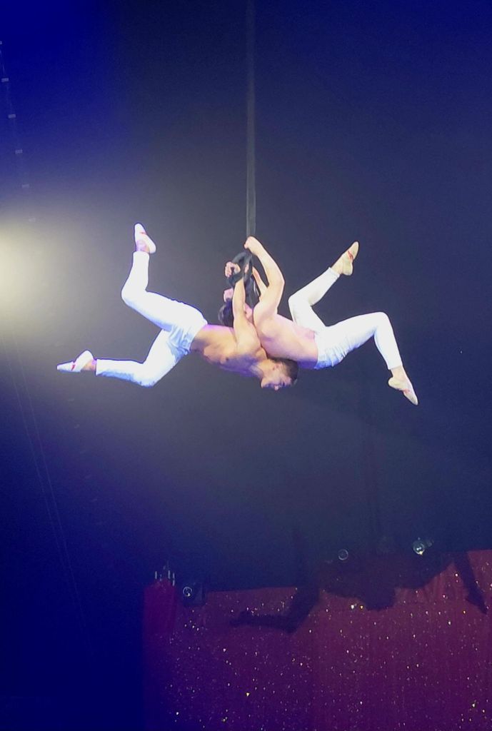 Elena Brukson, die Tochter, zeigt an den Vertikaltücher eine Akrobatik bei der der Herzschlag für einen Moment aussetzt. Nach schnellen Abfaller von der Zirkuskuppel geht es auch genau so schnell wieder hoch. Ein Spagat in luftiger Höhe an dem Vertikaltuch ist eben so spektakulär wie variantenreichen Abfaller.