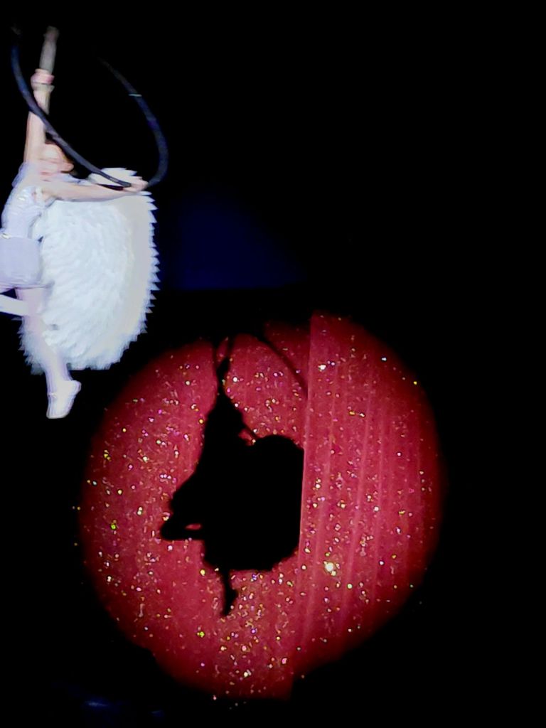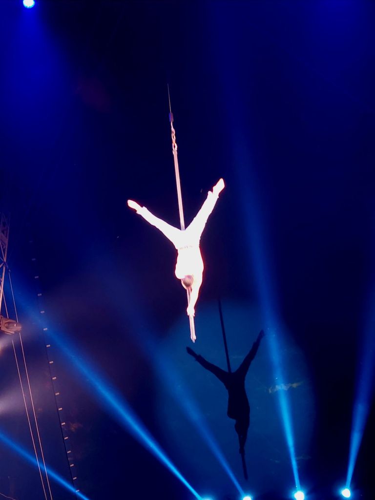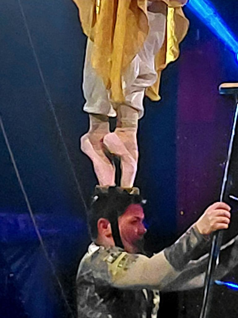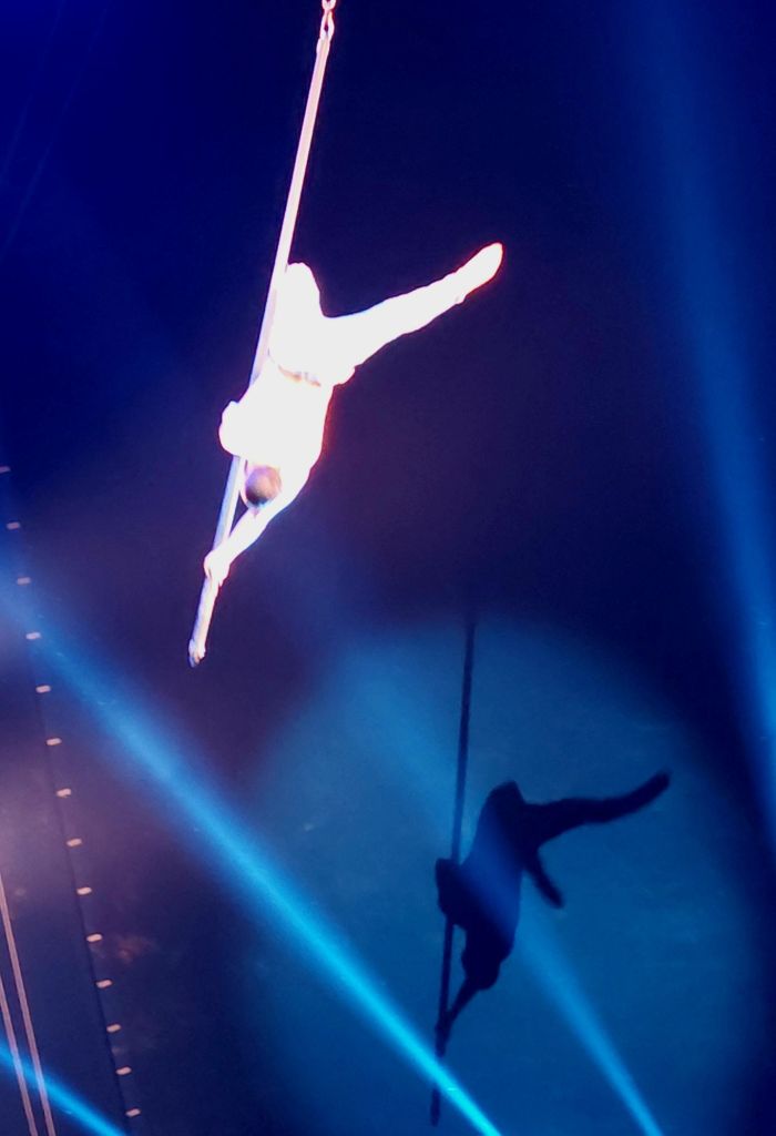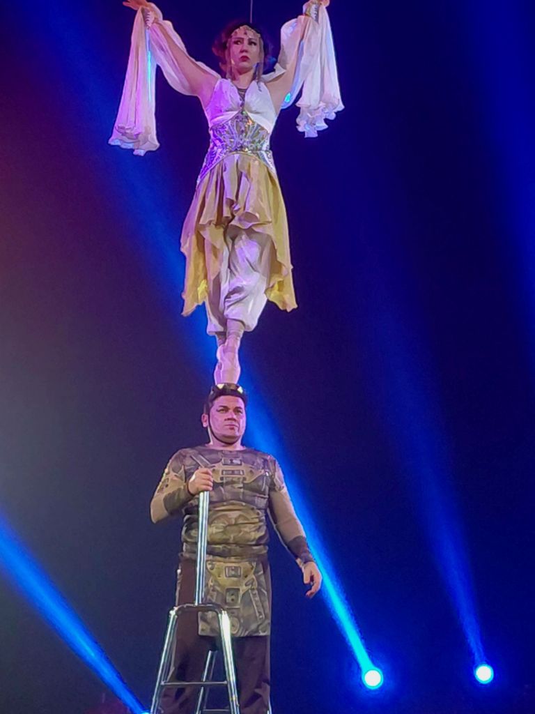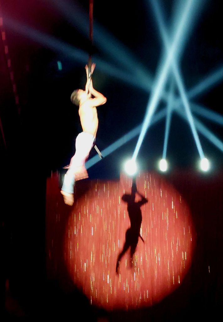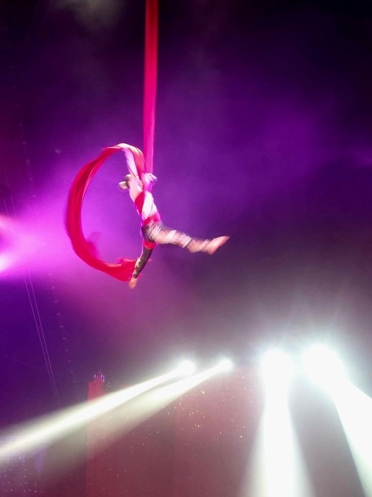 Elena Brukson, die Tochter, zeigt an den Vertikaltücher eine Akrobatik bei der der Herzschlag für einen Moment aussetzt. Nach schnellen Abfaller von der Zirkuskuppel geht es auch genau so schnell wieder hoch. Ein Spagat in luftiger Höhe an dem Vertikaltuch ist eben so spektakulär wie variantenreichen Abfaller.