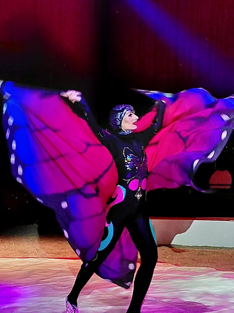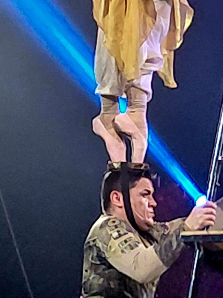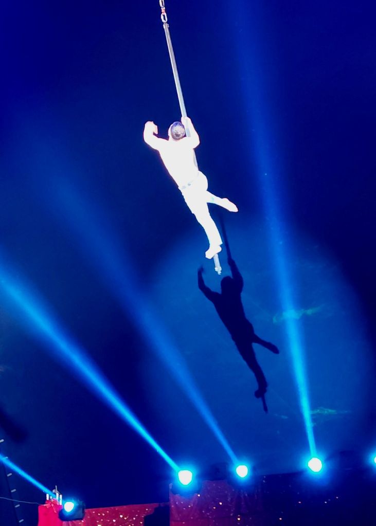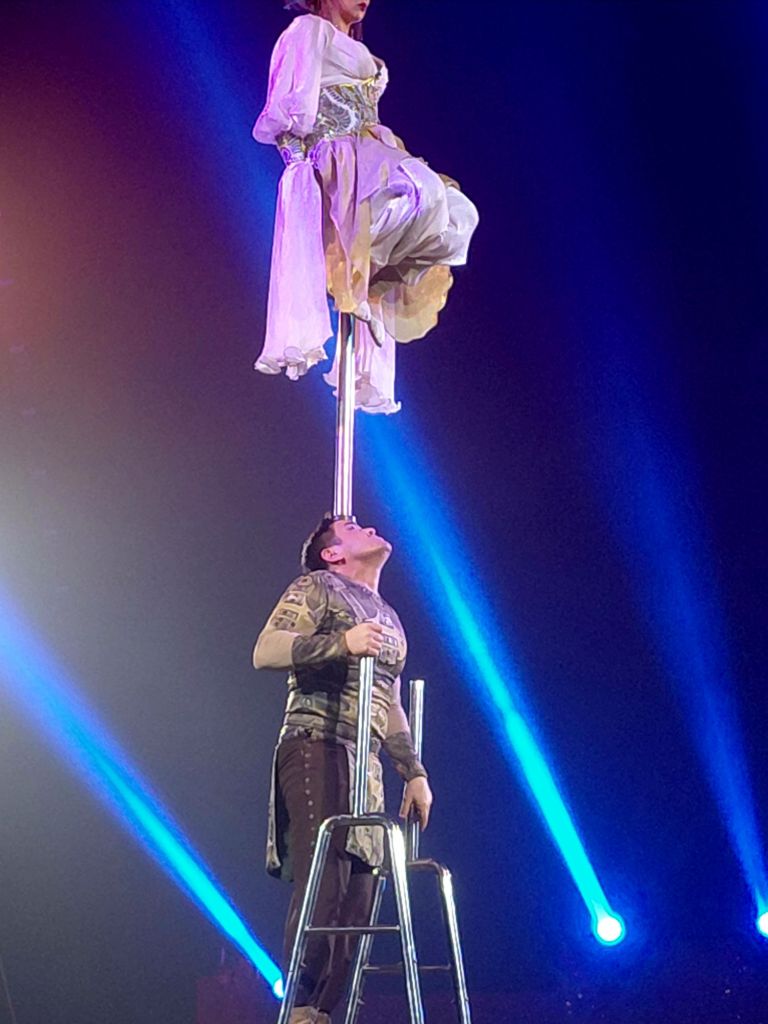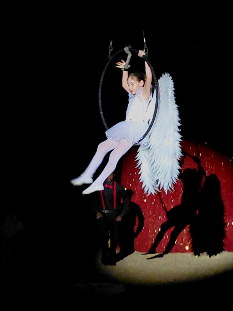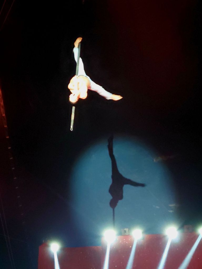 Elena Brukson, die Tochter, zeigt an den Vertikaltücher eine Akrobatik bei der der Herzschlag für einen Moment aussetzt. Nach schnellen Abfaller von der Zirkuskuppel geht es auch genau so schnell wieder hoch. Ein Spagat in luftiger Höhe an dem Vertikaltuch ist eben so spektakulär wie variantenreichen Abfaller.