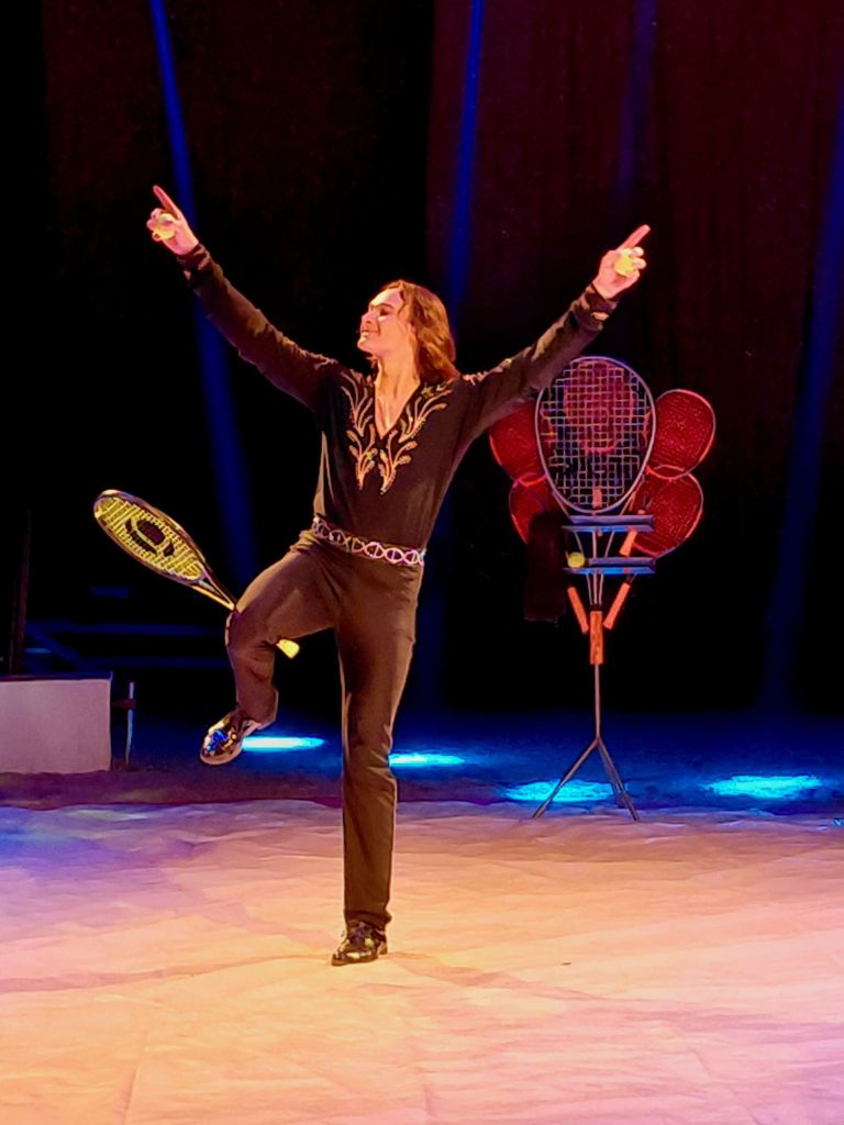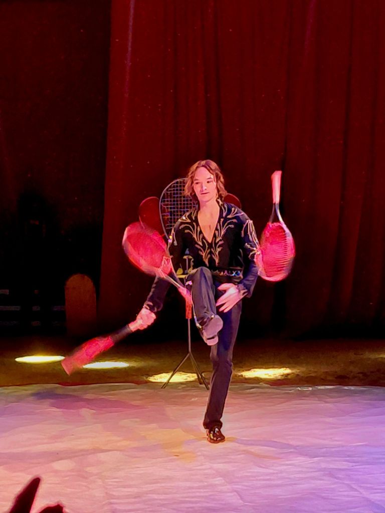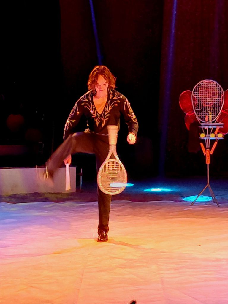 Rico Brukson, der Sohn, begeistert das Publikum als Jongleur mit bis zu fünf Tennisschläger. Schneller als man mit dem Auge folgen kann, fliegen die Tennisschläger hoch und wirbeln durch die Manege.