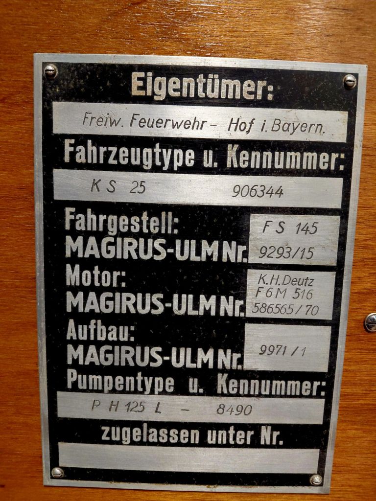 Der Magirus FS 145 Karftfahrspritze KS 25 wurde 1939 an die Freiwillige Feuerwehr der Stadt Hof ausgeliefert. Entsprechend den damaligen geltenden Vorschriften war die Fahrzeugfarbe Tannengrün.
