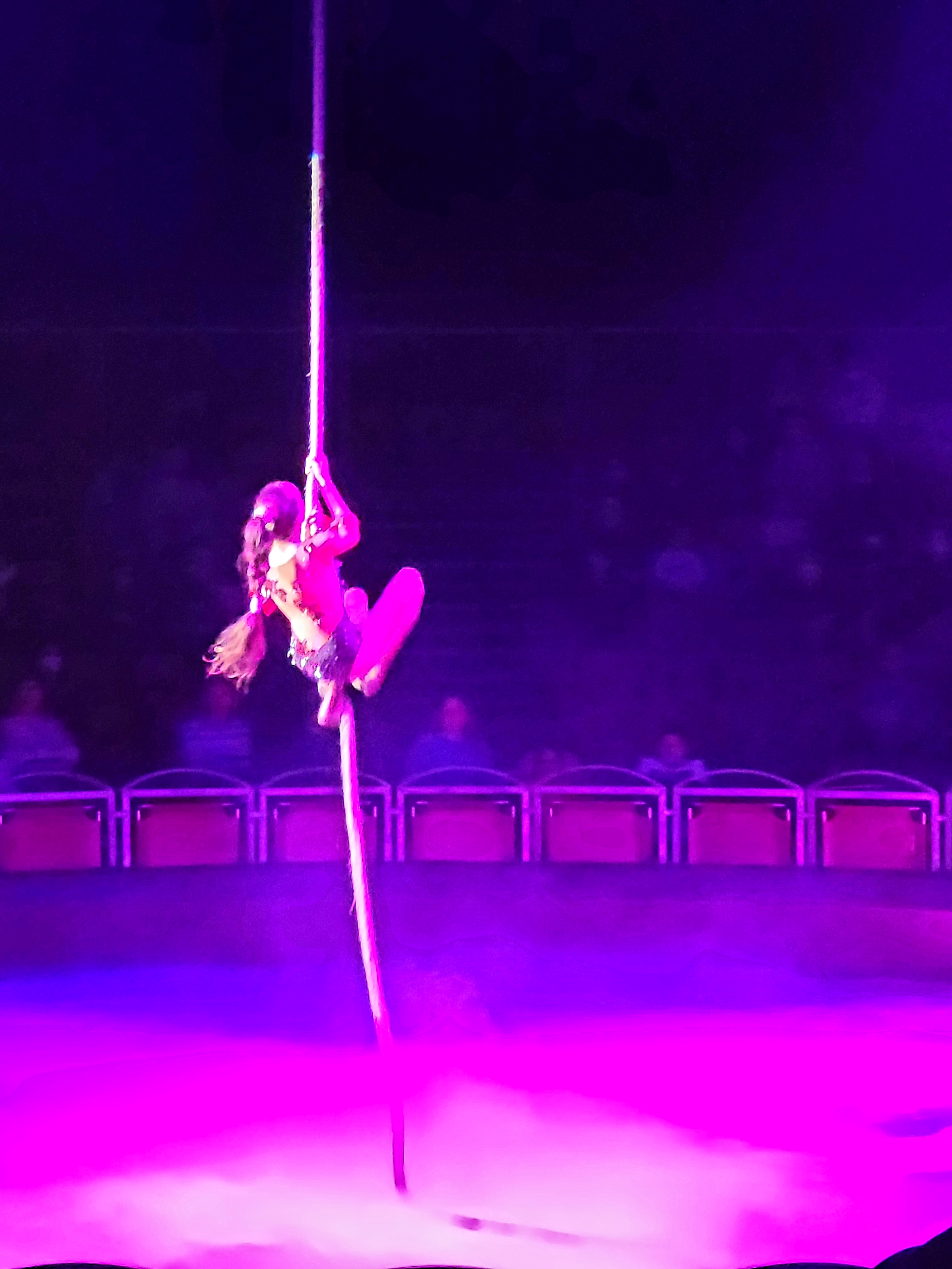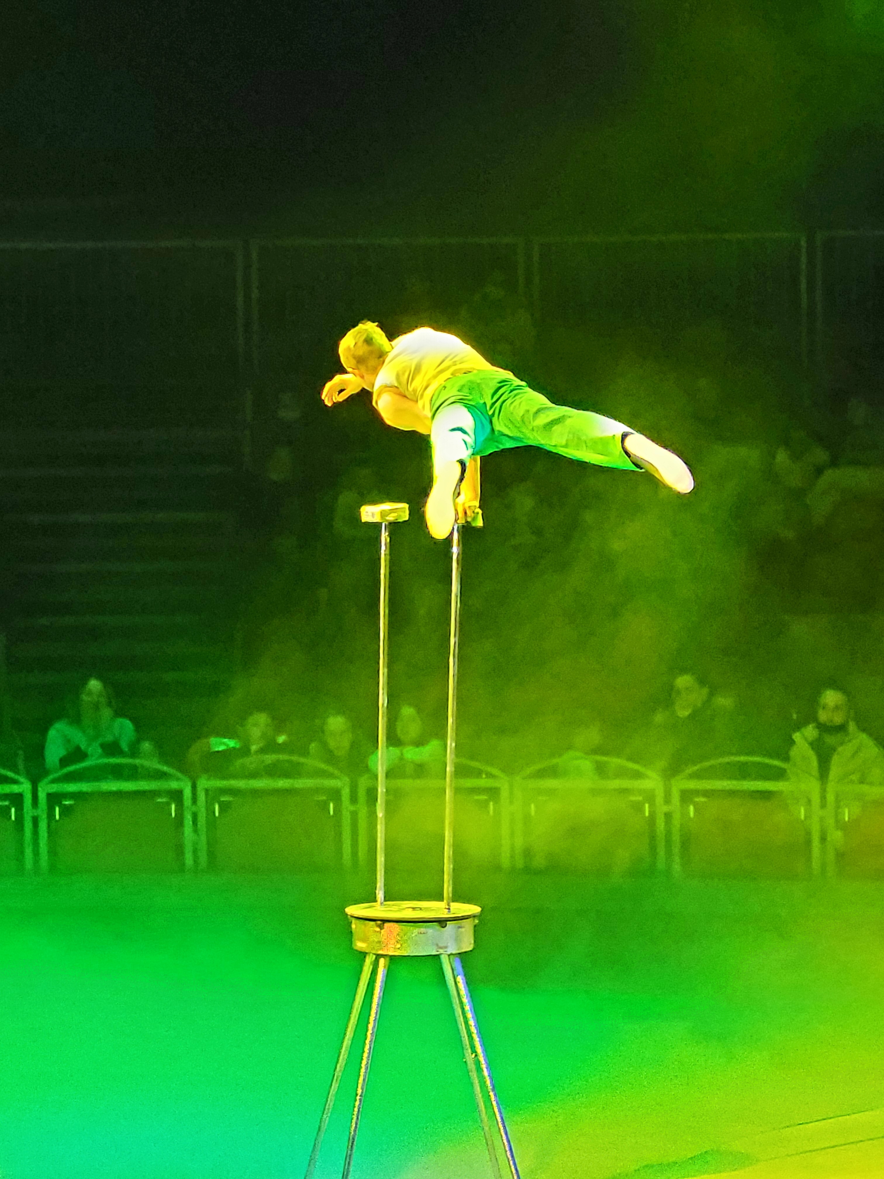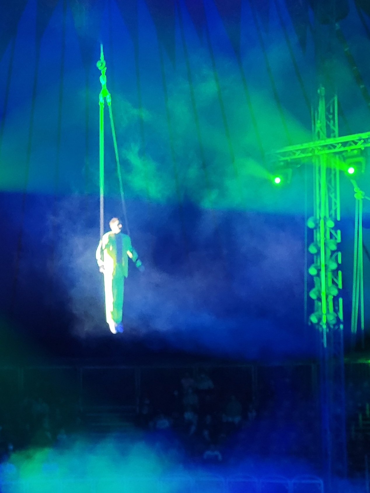 Die Show begann mit einer Hochseil Akrobatik von Akrobaten aus Kolumbien. Es ist immer wieder atemberaubend, was diese Menschen in schwinderregender Höhe mit einer Leichtigkeit zeigen. Der absolute Höhepunkt war die Menschliche Pyramide auf dem Hochseil.