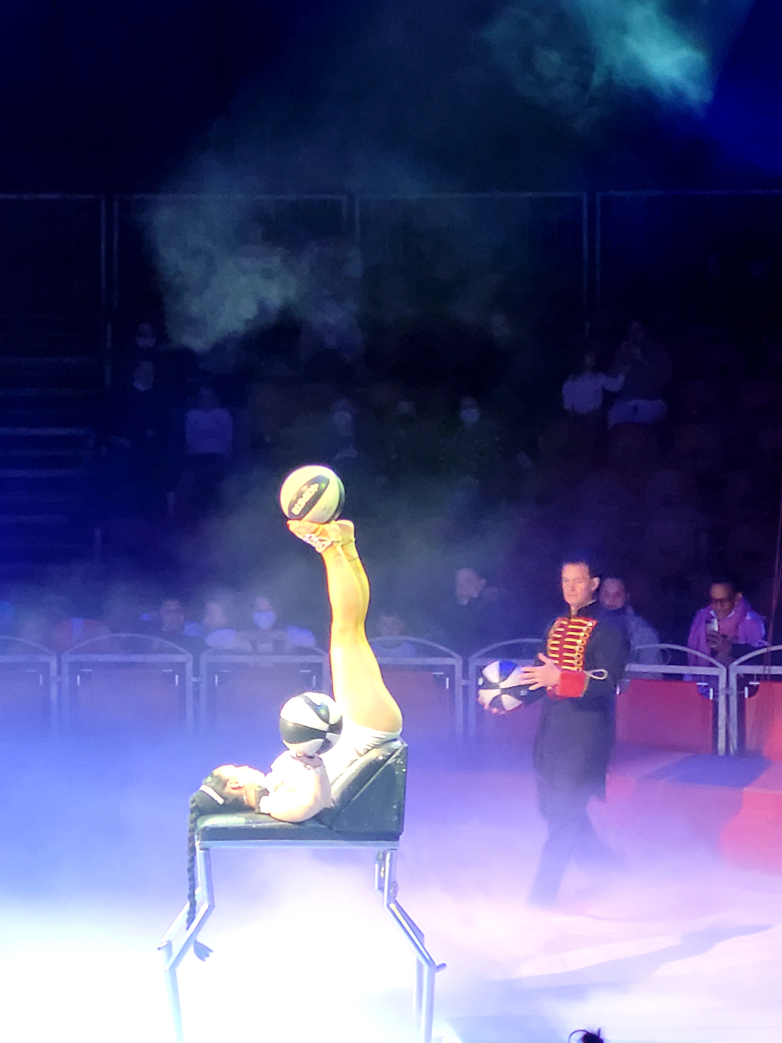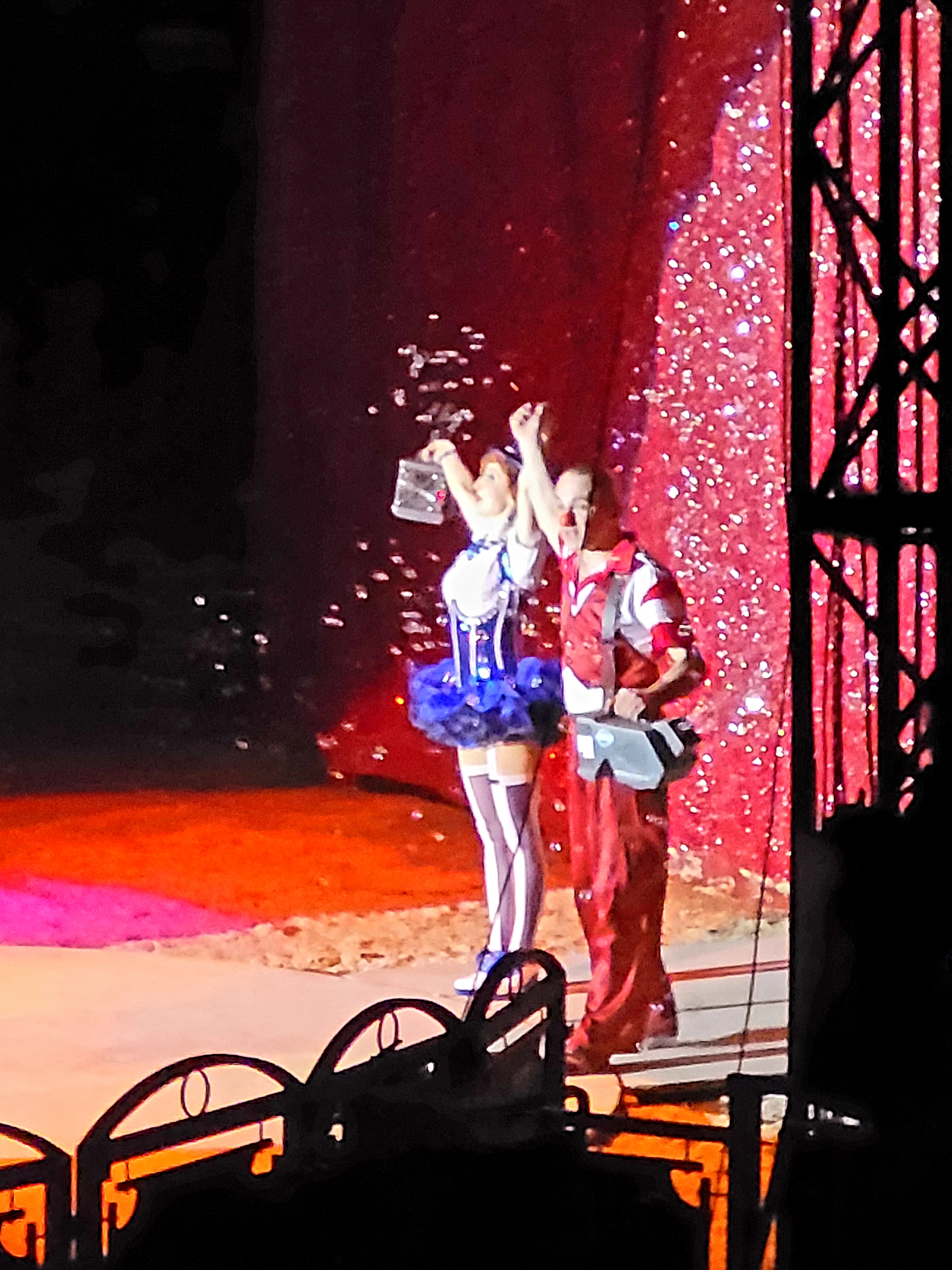 Die Show begann mit der Einleitung über den Circus Gebrüder Barelli. Die Einleitung sprach der Sohn vom Gründer des Circus. Genau der Mann, der im Vorzelt noch mit mir geflirtet hatte. Der Mann rechts neben mir grinste mich an „Mit dem hast du doch eben gesprochen…“ „Hmmm… Ja.“